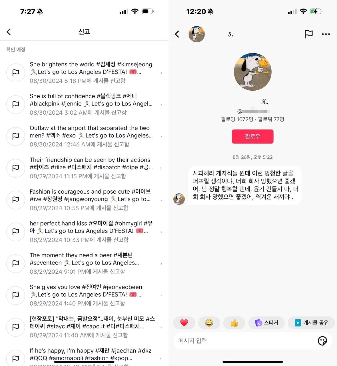 - BTS 슈가 사건 여파로 디스패치 틱톡 계정이 몸살을 앓고 있는 중이다. 일부 팬들이 업데이트 되는 영상 마다 댓글을 도배한다. 지속적으로 계정 신고도 하고 있다. 덕분에 팔로워도 줄고, 영상 도달율도 줄었다.